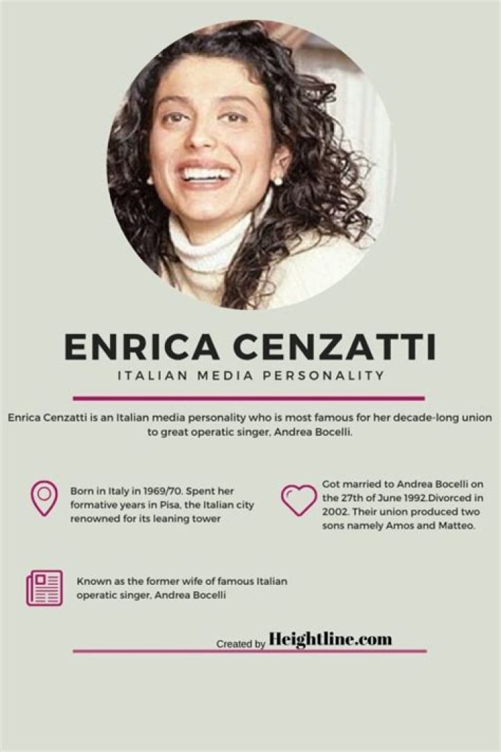 - Former Spouse: Enrica Cenzatti was married to Andrea Bocelli from 1992 to 2002.