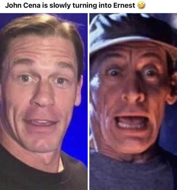 John Cena looks like Ernest is a comparative statement that draws a resemblance between former WWE wrestler John Cena and the late actor and comedian Jim Varney, who is best known for his portrayal of Ernest P. Worrell.
