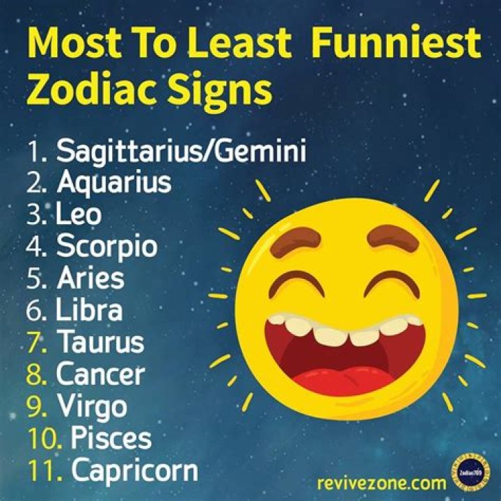 "Zodiac signs funniest" is an adjective phrase referring to the ranking of astrological signs in terms of their perceived humor and wit. For instance, Sagittarius are often considered the "life of the party" due to their jovial nature.